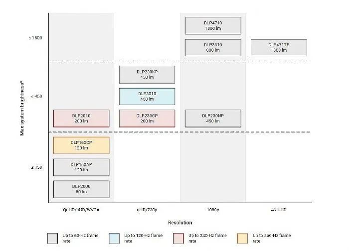 首先是,原生物理分辨率不足,所以實現(xiàn)2K/4K需要采用抖動成像技術(shù);其次是,亮度支撐能力下降——即投影機(jī)亮度不僅由光源亮度決定,也由光閥的最高承載能力決定。其中,0.33英寸光閥的顯示面積只有0.47光閥的一半,其極限亮度照射承載能力略大于0.47光閥的一半。恰是這一點決定了0.33的2K DLP投影的亮度表現(xiàn)力一直無法媲美0.47光閥產(chǎn)品。
