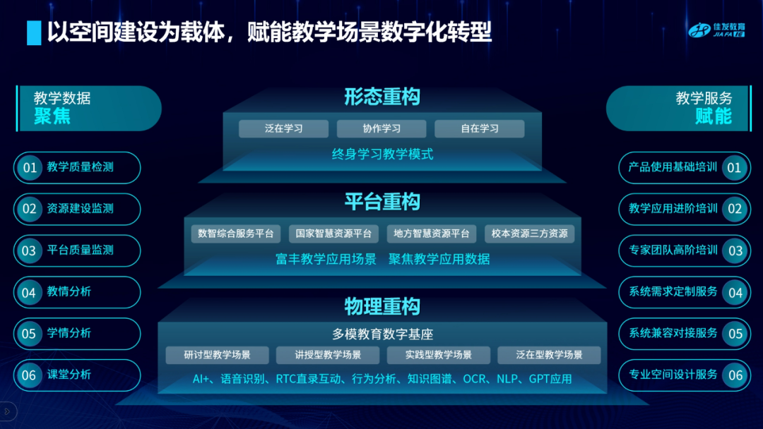 經(jīng)過(guò)二十余載的行業(yè)經(jīng)驗(yàn)沉淀,佳發(fā)教育結(jié)合市場(chǎng)需求和新一代信息技術(shù),2023年正式提出“一個(gè)定位、兩個(gè)堅(jiān)持、三項(xiàng)舉措”的“AI+”戰(zhàn)略,全面升級(jí)自有產(chǎn)品矩陣,運(yùn)用人工智能技術(shù)不斷提升產(chǎn)品能力和應(yīng)用價(jià)值,探索新場(chǎng)景、新應(yīng)用,更好地賦能教育。佳發(fā)教育在整合新的信息技術(shù)和行業(yè)實(shí)踐經(jīng)驗(yàn)的基礎(chǔ)上,聚焦教育的數(shù)字化核心,推出了智慧教室的解決方案。該方案以重構(gòu)教學(xué)空間、創(chuàng)新教學(xué)模式、深化教學(xué)管理、加強(qiáng)數(shù)據(jù)治理為核心,聚焦“數(shù)據(jù)采集匯聚、數(shù)據(jù)存儲(chǔ)治理、數(shù)據(jù)智能應(yīng)用”等方面。