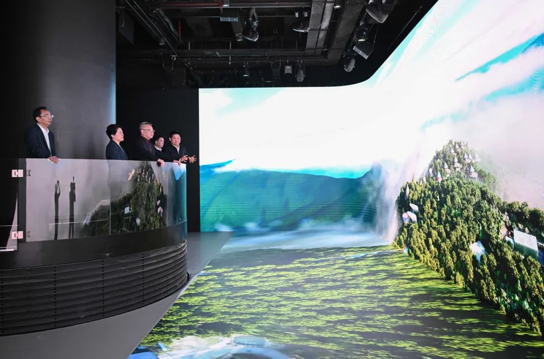 在明和集團(tuán)董事長傅高武的陪同下,沈曉明一行考察了明和創(chuàng)新大廈,聽取了明和發(fā)展歷程、科技創(chuàng)新、業(yè)態(tài)創(chuàng)新和產(chǎn)業(yè)布局等情況,切身感受到了明和創(chuàng)意策劃、內(nèi)容創(chuàng)作和強(qiáng)大落地的綜合能力。同時,沈曉明一行參觀了音視頻體驗空間、文化裝備體驗中心,在虛擬與現(xiàn)實的藝術(shù)空間,沉浸式體驗新媒體技術(shù)賦能傳統(tǒng)文化的視覺盛宴,并近距離欣賞了一場明和自主設(shè)計和編排的舞臺機(jī)械秀,在光影交織的夢幻世界里感受“硬技術(shù)”和“軟創(chuàng)意”融合共生的魅力。