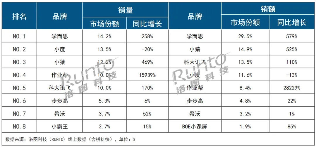 上半年的規(guī)模預(yù)測(cè)方面,洛圖科技(RUNTO)判斷,中國(guó)學(xué)習(xí)平板線上市場(chǎng)的全渠道銷量將為158萬(wàn)臺(tái),同比增長(zhǎng)55%。