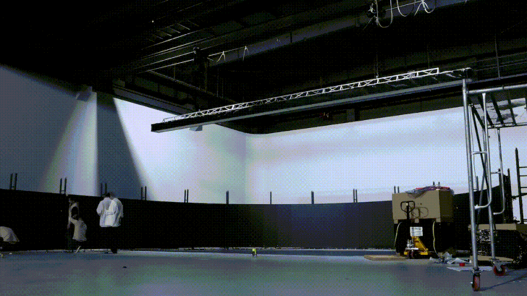 為此,電影制作團(tuán)隊(duì)攜手ICT AG與HALOSTAGE,在匈牙利布達(dá)佩斯的Origo Studios精心打造了占地超過(guò)600平米的xR虛擬拍攝影棚,作為核心制作基地。影棚匠心獨(dú)具,由2400個(gè)LED箱體、四個(gè)量身定制的PIXERA ONE媒體服務(wù)器以及1500多個(gè)功放等尖端設(shè)備共同構(gòu)建,整體呈現(xiàn)為壯觀的197英尺x33英尺半圓形結(jié)構(gòu)。