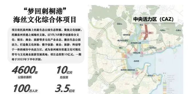 “夢回刺桐港”海絲文化綜合體“總面積4600畝,總投資10億元,預(yù)計今年實現(xiàn)開業(yè)。擬在海絲生態(tài)公園利用VR技術(shù)和水幕情景,再現(xiàn)宋元古泉州刺桐港繁華景象。主要包括《刺桐時代元宇宙實景演藝》項目、“刺桐港·泉州匯”水上文商旅綜合體、海絲文化度假酒店、“夢回刺桐”IP數(shù)字創(chuàng)意產(chǎn)業(yè)等項目。