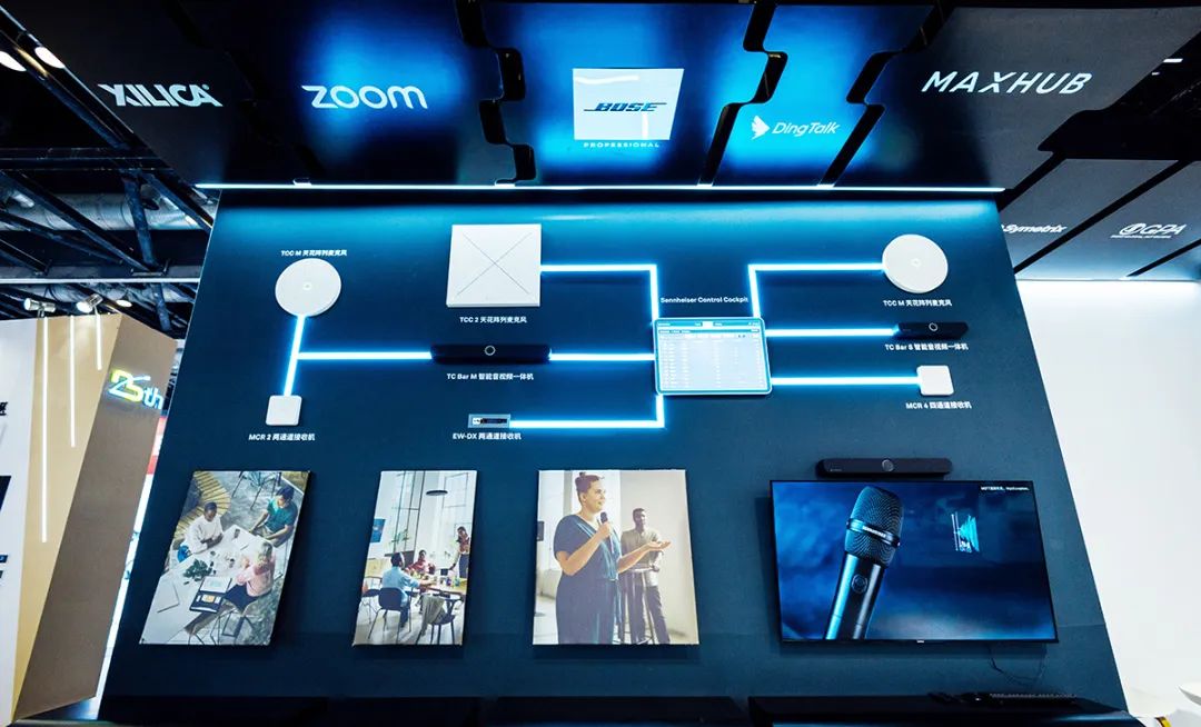在展臺的核心區(qū)域,森海塞爾通過拓?fù)鋱D的形式,直觀且生動地展示了森海塞爾音頻解決方案的完整生態(tài)系統(tǒng):通過TCC 2和TCC M天花陣列麥克風(fēng)來滿足不同規(guī)模的會議空間需求,以TC Bars智能音視頻一體機為核心進(jìn)行信號處理和交換。該系統(tǒng)還可以無縫集成森海塞爾EW-DX無線數(shù)字麥克風(fēng)系統(tǒng)和Speechline數(shù)字無線系列等產(chǎn)品。