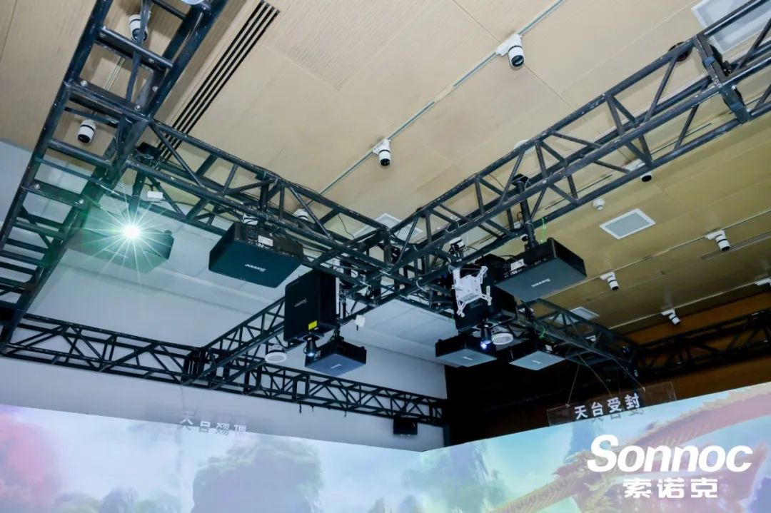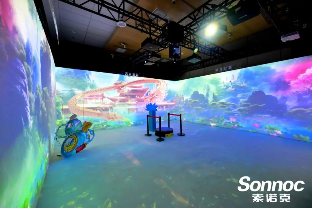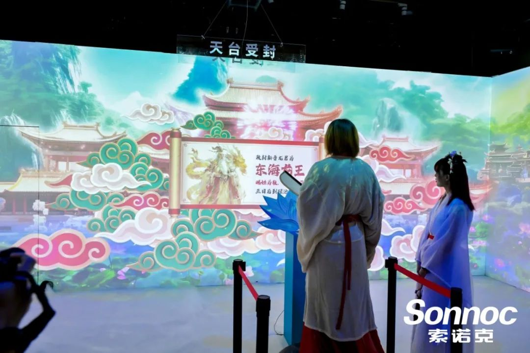 深入步入展項,在天宮受封沉浸式投影展區(qū)中,2臺索諾克Sonnoc新品SNP-LU13KC激光投影機與6臺SNP-LC85DU激光投影機打造充滿神秘色彩的沉浸式“天宮”世界。