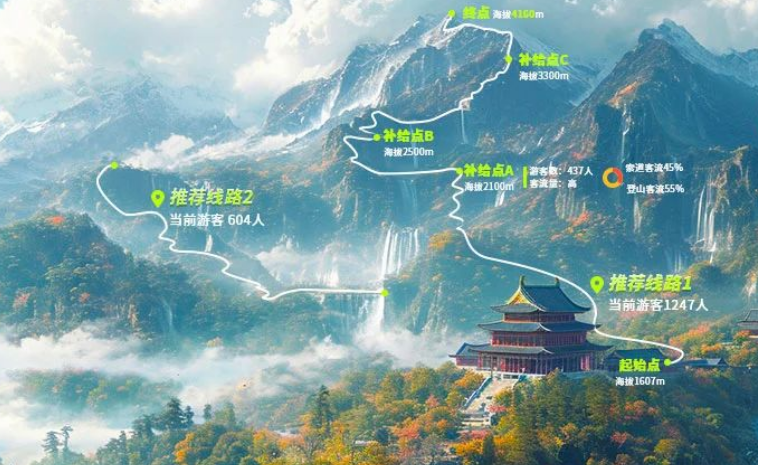 景區(qū)人流熱力圖:平臺實時呈現(xiàn)景區(qū)內游客分布狀態(tài),以熱力圖清晰展示。此功能有助于管理者精準掌握客流走向、密度,以便科學調配資源、強化安全管理。同時,游客亦可借助熱力圖輕松避開人群密集區(qū),規(guī)劃更為順暢舒適的游覽路徑。