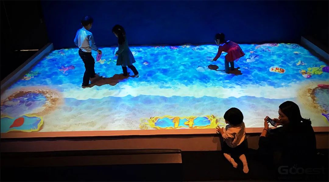 除此之外,互動投影還能為觀眾帶來了趣味的觸覺體驗。例如當觀眾踏入以池塘為主題的地面投影區(qū)域時,會觸發(fā)波紋、水花等交互效果,給人一種真實的感覺。