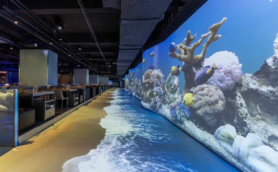 而當游客進入森林主題的場景時,地面又會浮現(xiàn)出各種植物、爬蟲、蝴蝶等多樣生物的豐富畫面,讓游客仿佛真的置身于生態(tài)森林之中。