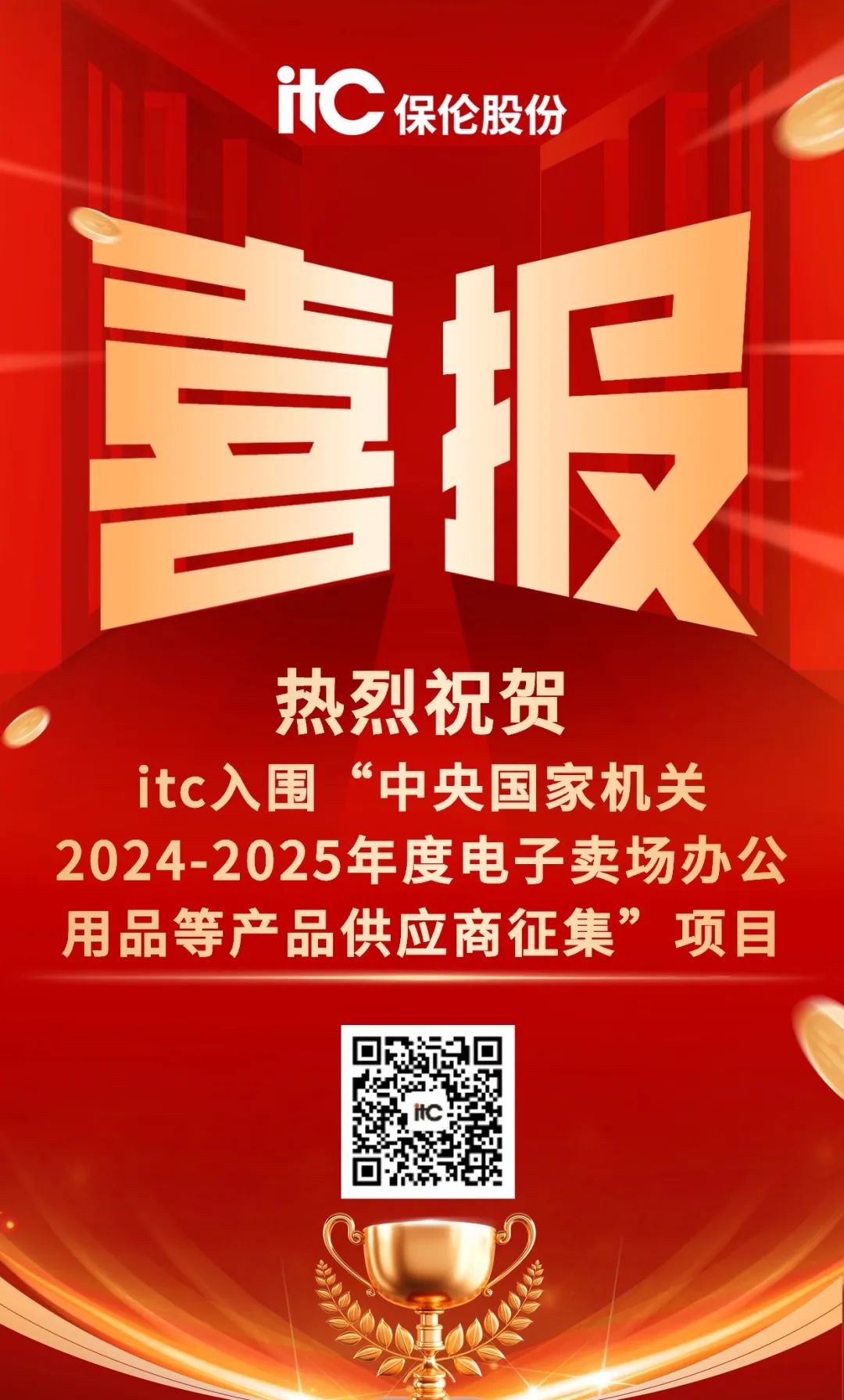 4月25日,中央政府采購(gòu)網(wǎng)發(fā)布“中央國(guó)家機(jī)關(guān)2024-2025年度電子賣(mài)場(chǎng)辦公用品等產(chǎn)品供應(yīng)商征集中標(biāo)公告”。itc保倫股份憑借優(yōu)異的產(chǎn)品品質(zhì)、過(guò)硬的技術(shù)實(shí)力和深厚的行業(yè)經(jīng)驗(yàn),在眾多廠商中脫穎而出,成功中標(biāo)入圍。