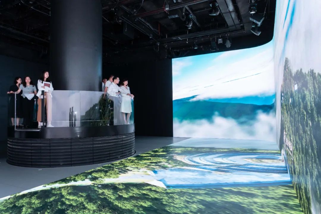 (調(diào)研組一行體驗(yàn)音視頻體驗(yàn)中心,感受傳統(tǒng)文化與現(xiàn)代科技交相輝映,湖湘山水與數(shù)字藝術(shù)融合共生)