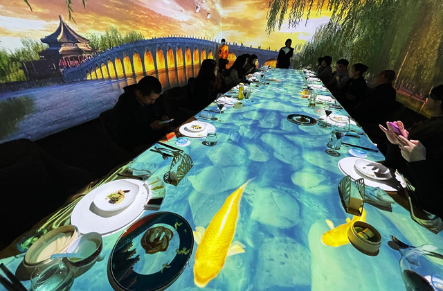 應(yīng)用沉浸式投影技術(shù),當(dāng)食客吃飯時,一只鳥可能會落在餐具上,觸碰它便會飛走。