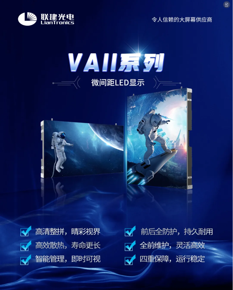 本次大屏均采用聯(lián)建光電爆款小間距產(chǎn)品——VAII系列。VAII是小間距界的常青樹,不僅顯示細膩自然,畫質(zhì)高清,高刷無影,對比度高,更設計隱藏式把手、防漏光設計、安全倒角、底部防磕碰等人性化細節(jié),讓使用體驗更流暢,適用于能源生產(chǎn)、智慧城市、交通樞紐、展廳展示、會議中心等場景,具有全場景適配性。