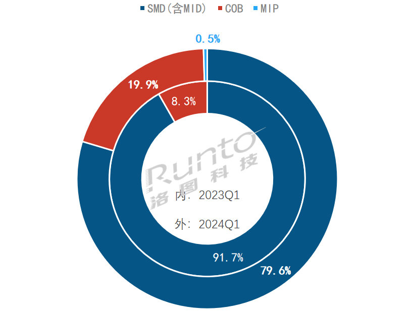 2024年Q1 中國(guó)大陸小間距LED顯示屏市場(chǎng)按面積封裝技術(shù)結(jié)構(gòu)及變化