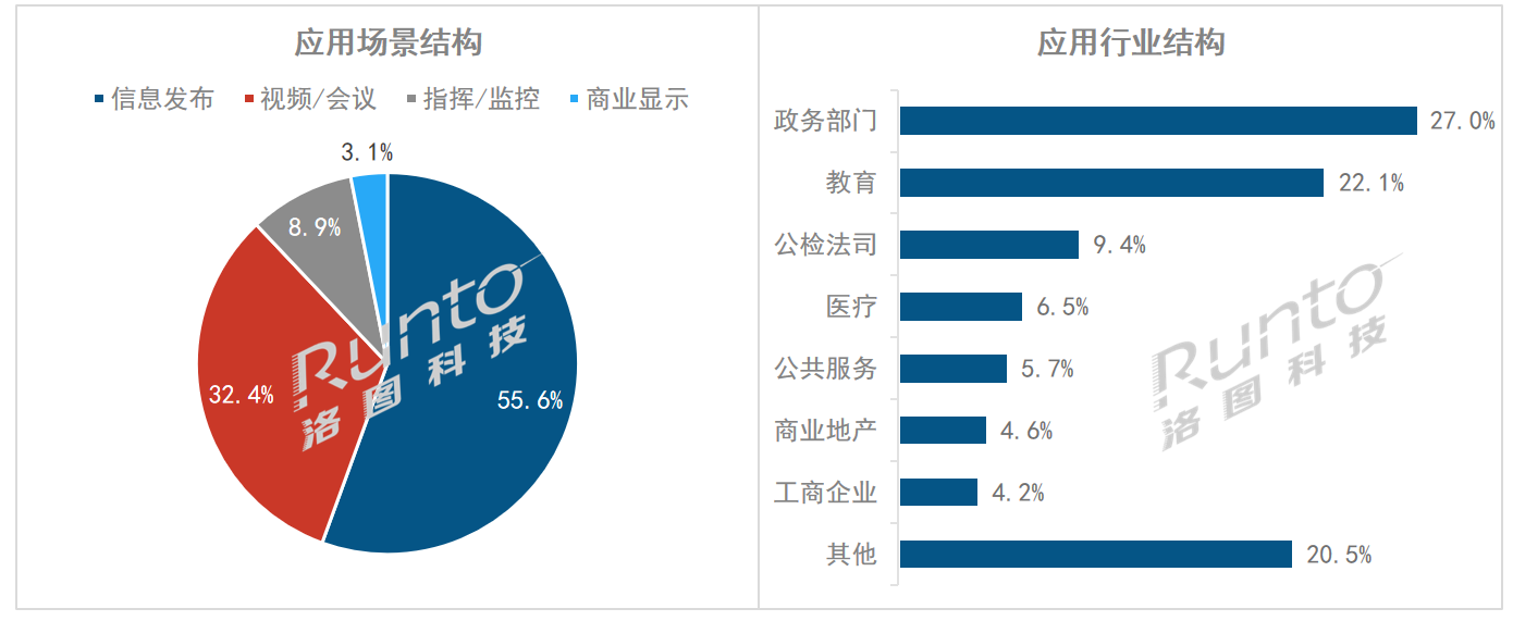 LED顯示受益于微間距化加速和MLED技術(shù)的發(fā)展,對(duì)傳統(tǒng)顯示技術(shù)如液晶拼接、DLP拼接、會(huì)議投影等產(chǎn)品的替代,已廣泛發(fā)生于政府應(yīng)急、智慧城市、公檢法司、能源、交通、廣電等各行各業(yè)。