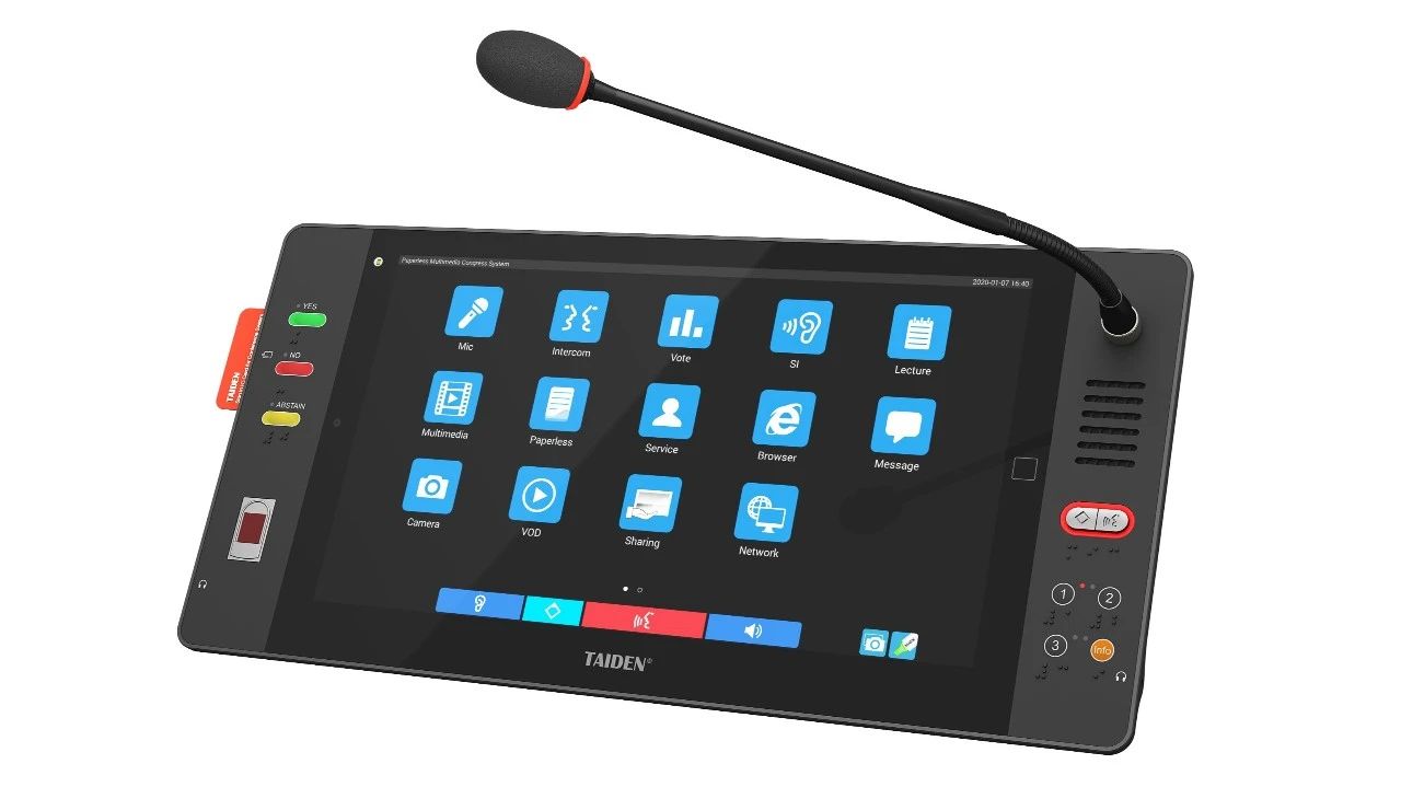 針對(duì)19號(hào)會(huì)議廳的使用需求,TAIDEN還定制了一系列個(gè)性化會(huì)議配套產(chǎn)品,如與無(wú)紙化多媒體終端配套使用的嵌入式、臺(tái)面式電子墨水名牌,側(cè)邊席位上媒體人員使用的12英寸多媒體終端等。