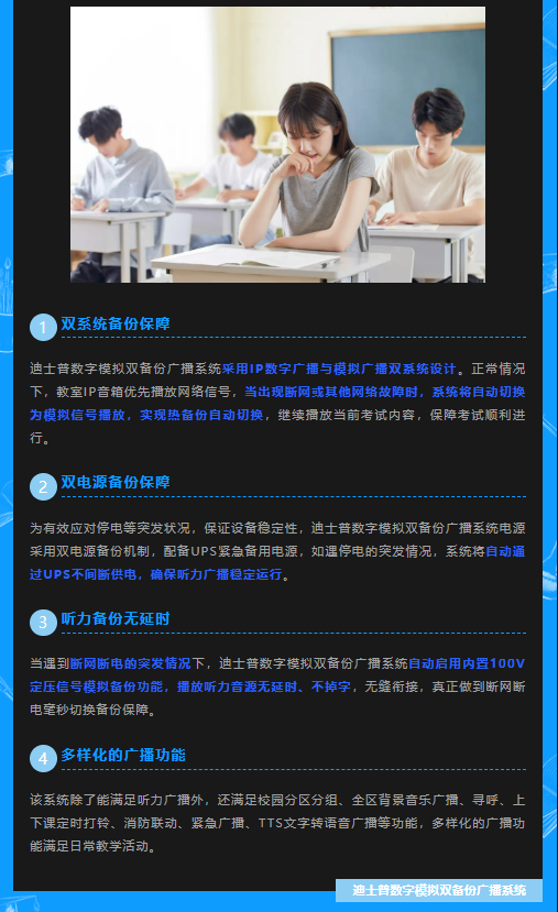 廣州市迪士普音響科技有限公司(以下簡稱“迪士普企業(yè)”)始創(chuàng)于1988年,是一家集公共廣播系統(tǒng)、智能無紙化會議系統(tǒng)、電子教學系統(tǒng)和政務大廳協(xié)同辦公系統(tǒng)的研發(fā)、生產(chǎn)和銷售為一體的大型國家級高新技術企業(yè)。迪士普企業(yè)是公共廣播國家標準GB50526《公共廣播系統(tǒng)工程技術規(guī)范》的主編單位,多次被評為“公共廣播行業(yè)最具競爭力品牌第一名”、“公共廣播及會議系統(tǒng)十大優(yōu)秀品牌”、“十佳廣播會議品牌”、“中國智能建筑行業(yè)會議擴聲系統(tǒng)十大品牌”、“智能建筑行業(yè)優(yōu)秀民族品牌”、“專業(yè)音響燈光10大國際品牌”、“中國演藝設備行業(yè)20強企業(yè)”、“中國演藝設備行業(yè)優(yōu)質(zhì)產(chǎn)品”、“高新技術企業(yè)”、“十佳民族品牌”、“廣東省重合同守信用企業(yè)”“廣州市著名商標”,是北京奧運會、上海世博會、廣州亞運會、深圳大運會、中國高鐵、老撾亞歐首腦會議、中國博覽會會展綜合體等國內(nèi)外重大工程項目和眾多學校、商城、超市、酒店、機場、車站、公園景點、辦公大樓、生活小區(qū)、政府機構、工廠企業(yè)等的音頻設備供應商。