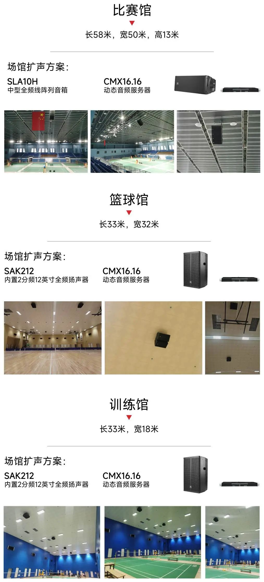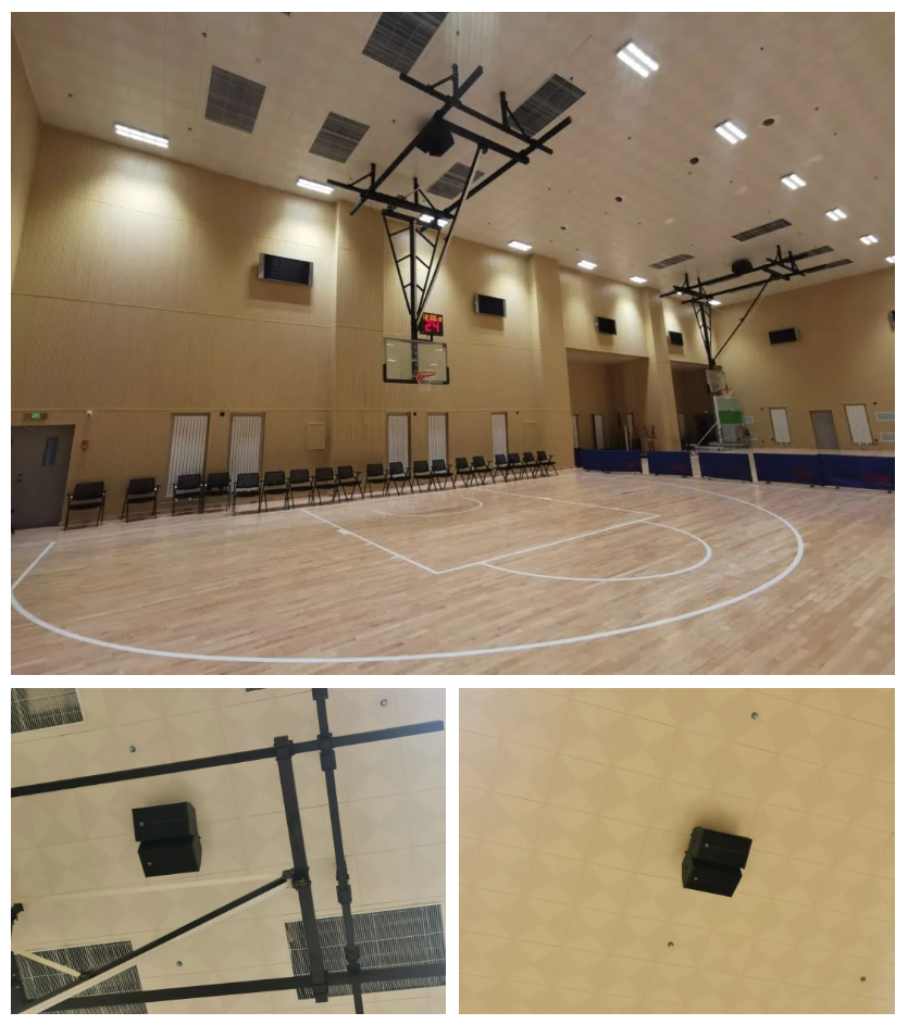 我們根據(jù)其建筑結(jié)構(gòu)特點和功能需求設(shè)計頂部吊裝點聲源揚聲器,其中訓(xùn)練館8只SAK212,籃球館16只SAK212全頻音箱。