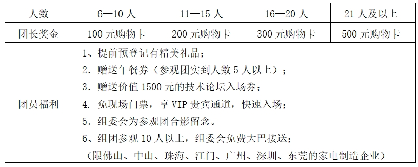 10人以上組團參觀,組委會提供免費大巴車接送;歡迎家電·智能家電·智能家居制造企業(yè)組團免費參觀洽談: