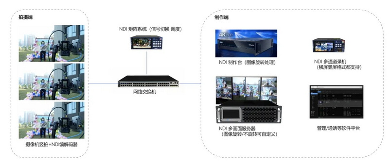 前端多機(jī)位攝像機(jī)豎屏拍攝,比如通過(guò)L支架固定方式,然后通過(guò)NDI編解碼器轉(zhuǎn)化為NDI IP流信號(hào)進(jìn)入后端的NDI切換臺(tái)及NDI字幕包裝系統(tǒng)。NDI切換臺(tái)可以將視頻信號(hào)進(jìn)行旋轉(zhuǎn)、豎屏切換、包裝等,隨后輸出豎屏PGM信號(hào)。系統(tǒng)中的NDI矩陣、NDI多通道錄機(jī)等,均可對(duì)豎屏信號(hào)(或橫屏)進(jìn)行切換分發(fā)及錄制;NDI多畫面系統(tǒng),也可以對(duì)多機(jī)位信號(hào)源進(jìn)行旋轉(zhuǎn)后呈豎屏顯示,或直接顯示豎屏PGM信號(hào),供導(dǎo)播監(jiān)看。該方案可以很好對(duì)豎屏場(chǎng)景進(jìn)行完整構(gòu)圖,不足是無(wú)法滿足橫屏制作,若同樣的節(jié)目場(chǎng)景還需輸出橫屏內(nèi)容,則需增加橫屏拍攝機(jī)位。