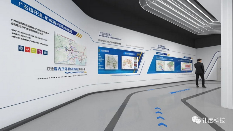 通過發(fā)光燈帶和圖文/燈箱的方式,展示增城西鐵路物流園、廣州東部公鐵聯(lián)運樞紐、海關(guān)監(jiān)管區(qū)等內(nèi)容;