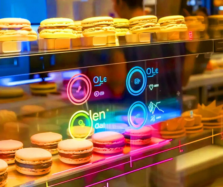 在日趨激烈的市場(chǎng)條件下,門店環(huán)境已成為軟性服務(wù)及消費(fèi)體驗(yàn)的重要一環(huán),如何強(qiáng)化產(chǎn)品服務(wù)認(rèn)知,加強(qiáng)品牌建設(shè)是各行業(yè)門店應(yīng)思考的關(guān)鍵所在。基于此,利用透明OLED顯示屏的優(yōu)勢(shì),能夠?yàn)榱闶鄄惋嬏峁┱故尽⑹浙y、點(diǎn)餐等全場(chǎng)景顯示應(yīng)用。其跳脫傳統(tǒng)顯示設(shè)備展示的局限性,通過視頻、滾播海報(bào)、動(dòng)態(tài)模板等動(dòng)態(tài)化內(nèi)容展示,將零售餐飲新品上市、節(jié)日活動(dòng)、產(chǎn)品促銷等信息呈現(xiàn)得淋漓盡致。