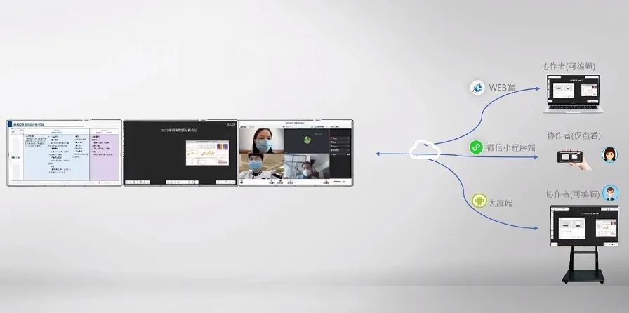 在遠(yuǎn)程視頻交互時(shí),通過(guò)異地“面對(duì)面”協(xié)作讓辦公、會(huì)議不再受場(chǎng)地的約束,真正實(shí)現(xiàn)多地多方的協(xié)同。會(huì)議主持人可跨空間控制多臺(tái)分會(huì)場(chǎng)平板,各會(huì)場(chǎng)也可查看、編輯、批注并同步書(shū)寫(xiě),實(shí)現(xiàn)跨屏云端交互協(xié)同,該功能也為異地會(huì)議、異地分享提供更便捷高效的會(huì)議溝通途徑。會(huì)后所有資料都能通過(guò)云端保存、共享和異地下載等方式查看,甚至還支持U盤(pán)、掃碼(可加密)、郵件、云端和直接打印等方式,充分實(shí)現(xiàn)會(huì)議內(nèi)容云保存、云下載。