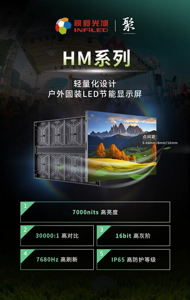 在戶外應(yīng)用場(chǎng)景上,視爵光旭帶來輕量化戶外節(jié)能顯示屏——HM系列,擁有7000nits超高亮度以及IP65高防護(hù)等級(jí)和低功耗節(jié)能等獨(dú)特優(yōu)勢(shì),在拼接上靈活應(yīng)用,可做90°無縫拼接,滿足不同應(yīng)用場(chǎng)景的需求,為地標(biāo)大牌、街景廣告牌、數(shù)字廣告牌、交通樞紐廣告牌等提供理想顯示方案。