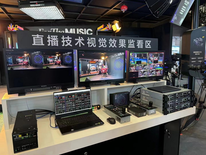 在智能化/輕量化節(jié)目制作拍攝區(qū)域,通過有針對性的布置展示用戶熟悉的索尼新聞攝錄一體機(jī)PXW-Z280、PXW-Z750、PXW-Z580這3款機(jī)器的高精準(zhǔn)度色彩還原等特性。拍攝區(qū)架設(shè)了自發(fā)光高飽和度光源的運(yùn)動物體,展示這些攝像機(jī)的自適應(yīng)矩陣功能,以及PXW-Z750的全域快門等拍攝特點(diǎn)。除此之外,拍攝區(qū)還特設(shè)一個位置,展示遠(yuǎn)端網(wǎng)絡(luò)管理服務(wù)器這個軟件新產(chǎn)品,該產(chǎn)品可以通過有線的形式與云臺攝像機(jī)相連,用于接收SRT流。與此同時,還通過現(xiàn)場5G私網(wǎng)和這臺PXW-Z280相連,接收其回傳的碼流,與整個拍攝流程相結(jié)合。這臺服務(wù)器還可以作為一個攝像機(jī)的管理終端,管理PXW-Z280所拍到的畫面內(nèi)容素材,并且由它傳輸?shù)教囟ǖ腎PTV地址。
