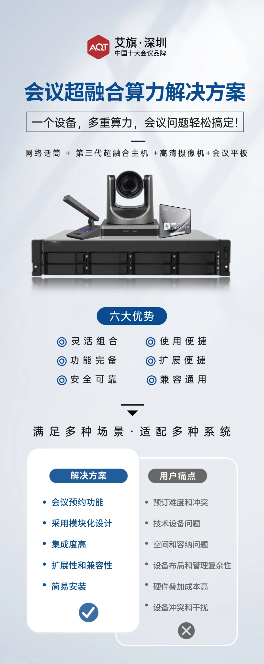 本項目采用AQT會議系統(tǒng)具備多角度拾音,清晰通話,發(fā)言控制三大特點,可針對發(fā)言者的聲音特點調(diào)節(jié)不同的音效,且可連接會議室音響擴聲設(shè)備,締造完美的會議系統(tǒng)方案。傳音清晰,優(yōu)質(zhì)擴聲,保證會議質(zhì)量。
