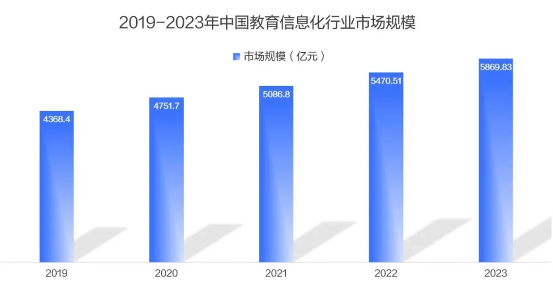隨著學校、家庭對教育質量認知的深刻轉變及消費偏好的高端化演進,教育智能硬件市場迎來了前所未有的發(fā)展機遇,需求量井噴。在此背景下,教育智能硬件市場呈現(xiàn)出爆發(fā)式增長態(tài)勢。據權威數據分析,2019年至2023年期間,中國教育信息化市場規(guī)模從4368.4億元增長至5869.83億元,年均增速超7%。當前,我國教育信息化市場仍存在尚未被滿足的需求,行業(yè)市場容量已接近萬億級別。