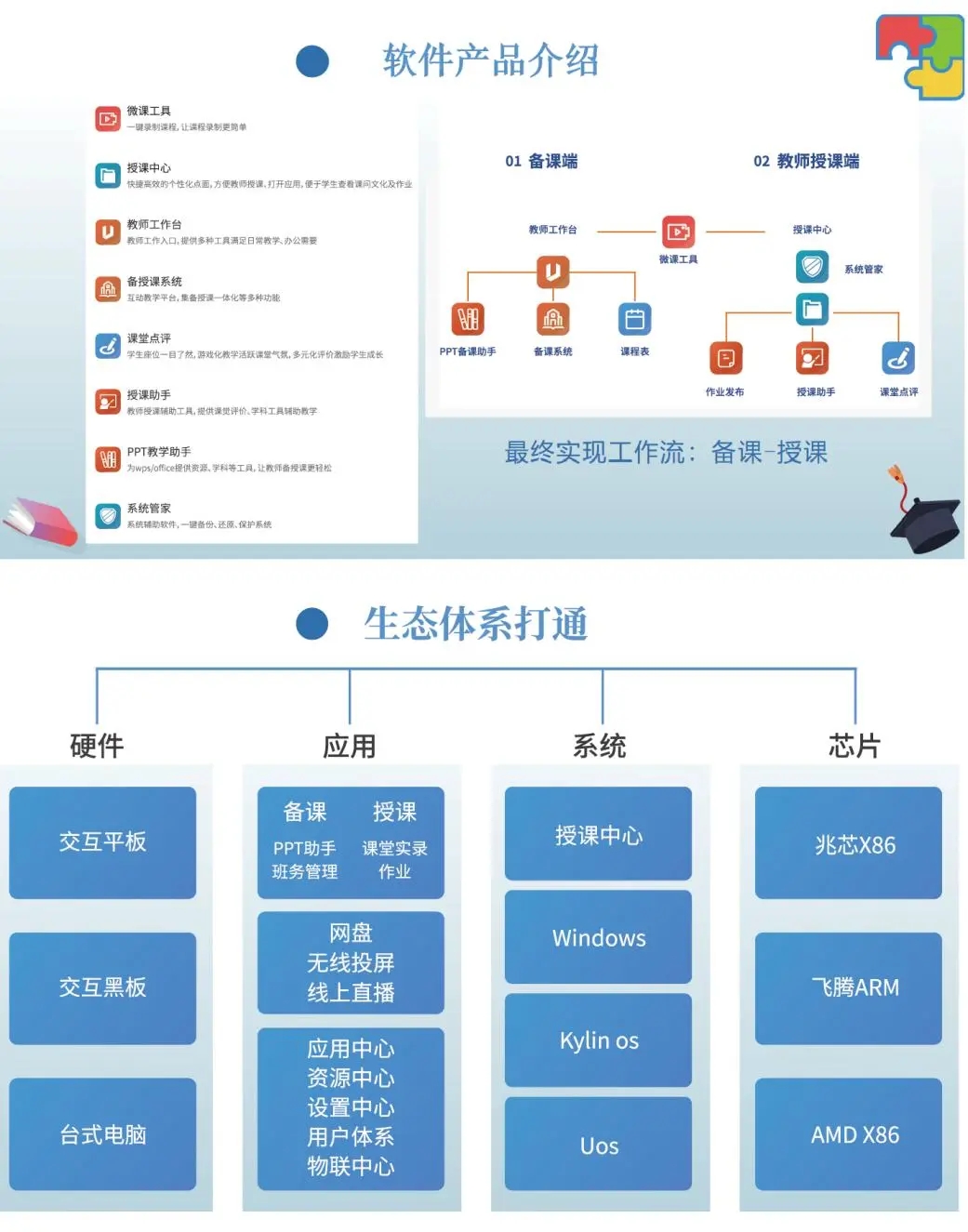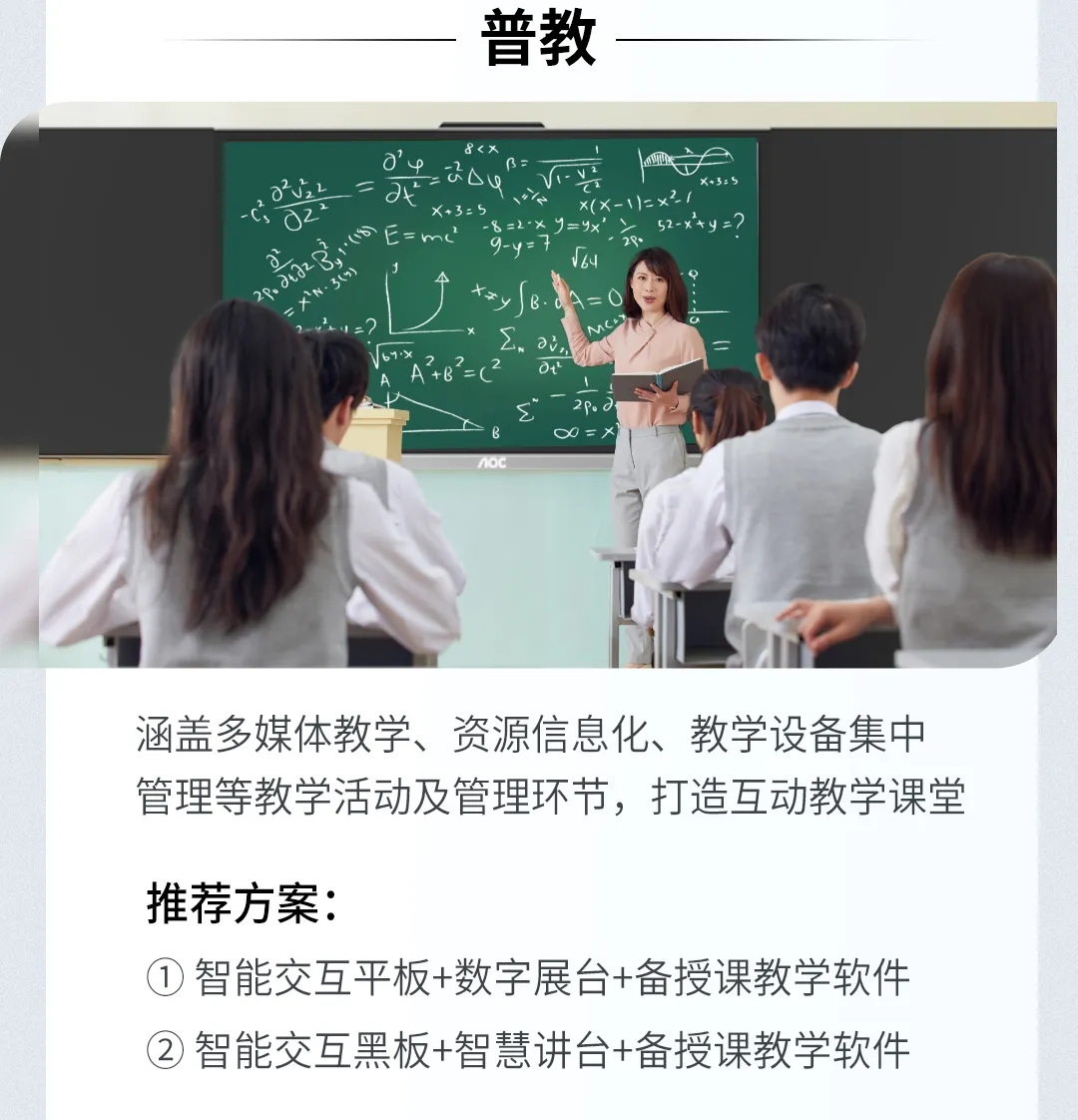 其可以有效建立在局域網、互聯(lián)網以及物聯(lián)網的基礎上,以智慧普教交互平板、智慧黑板等教育硬件產品為核心,融入智慧班牌、智慧講臺、視頻展臺等教學硬件設備,配套資源服務教學平臺、集控系統(tǒng)以及錄播系統(tǒng)等,進一步打造幼教/普教/高職智慧教室解決方案以及多媒體教室、課程研討室、錄播教室、培訓室、實驗室等細分化教育場景應用解決方案,以科技助力智慧教育創(chuàng)新!