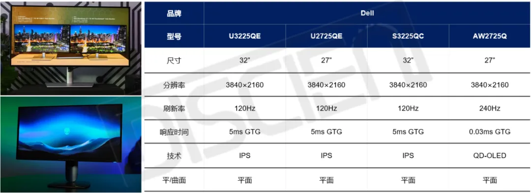 Dell(戴爾):Dell在本次展會(huì)上推出了 UltraSharp 和 Plus 系列3 款辦公產(chǎn)品,以及子品牌Alienware的電競(jìng)產(chǎn)品。其中UltraSharp的兩款產(chǎn)品U3225QE和U2725QE采用增強(qiáng)型 IPS 黑色技術(shù),對(duì)比度為 3000:1,與傳統(tǒng) IPS 面板相比,在常規(guī)的辦公環(huán)境中,黑色更深 47%,環(huán)境對(duì)比度提高 89%,4K分辨率,并通過(guò)了5星萊茵護(hù)眼認(rèn)證(TUV Rheinland Eye Comfort 3.0),有助于提高觀看舒適度,減少眼部疲勞。