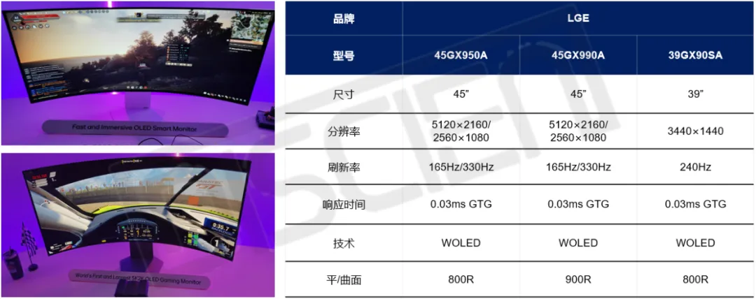 LGE(LG電子):LGE在展會(huì)上共發(fā)布3款新品WOLED顯示器,分別為45GX950A 和45GX990A,和一款內(nèi)置Web OS的曲面39”顯示器39GX90SA,均屬于LG UltraGear GX9 系列。其中兩款45”顯示器均配備5120×2160 分辨率,像素密度達(dá)125 PPI,相比目前采用3440x1440分辨率 45 “的83 PPI提升明顯。同時(shí)也支持雙模顯示,可在5120×2160/165Hz與2560×1080/330Hz之間切換。內(nèi)置Web OS的39GX90SA 旨在為用戶提供一流的游戲和內(nèi)容流媒體體驗(yàn),可充當(dāng)家庭娛樂(lè)中心,用戶無(wú)需 PC 或機(jī)頂盒即可訪問(wèn)所有常用的流媒體服務(wù)。