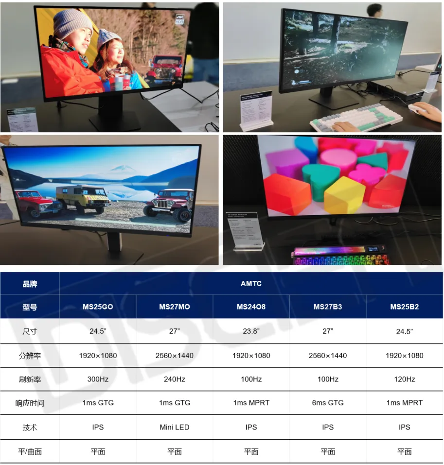 AMTC(兆馳):AMTC同樣展出了商用/電競(jìng)兩類產(chǎn)品。其中電競(jìng)產(chǎn)品為MS25GO和MS27MO,分別配備了24.5” FHD 300Hz和27” QHD 240Hz的配置。商用產(chǎn)品的豐富度同樣出色,尺寸范圍涵蓋了23.8”/24.5”/27”,刷新率也提升到了100Hz/120Hz,同時(shí)27”產(chǎn)品也有有QHD的選項(xiàng),滿足不同辦公場(chǎng)景的需要。