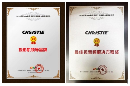 科視Christie榮獲數(shù)字工程音視網(wǎng)的“投影機領導品牌獎”(左)以及“最佳視音頻解決方案獎”(右)