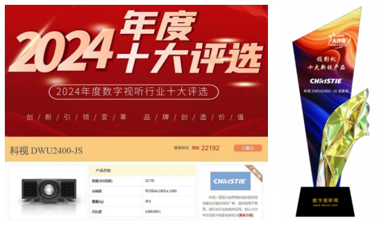 在數(shù)字視聽網(wǎng)的“2024年度十大評選”中,科視Christie也表現(xiàn)出色。全新Jazz系列DWU2400-JS 1DLP激光投影機憑借先進的電子技術和震撼的視覺效果,榮獲“十大新銳投影機產(chǎn)品”殊榮。這一獎項充分體現(xiàn)了科視在創(chuàng)新、性能和市場適應性方面的出眾表現(xiàn)。