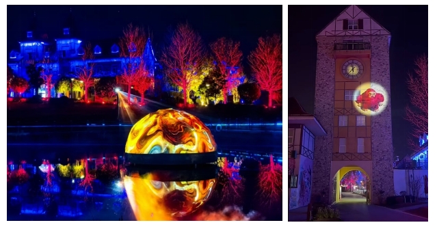 “依欄問月”球幕投影(左)和“鐘樓幻境”投影展示(右)由科視Inspire 系列投影機(jī)打造