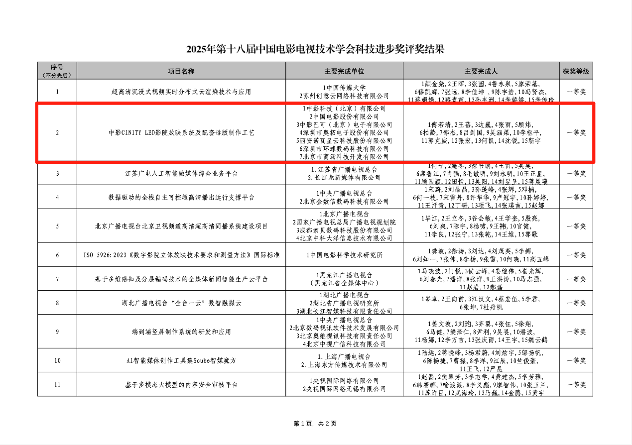 作為經國家科技部批準設立的綜合性科技獎項,中國電影電視技術學會科學技術獎以其公平、公正、嚴謹的評審程序著稱,旨在促進廣播影視和網絡視聽領域的技術創(chuàng)新與成果轉化,是國內廣播影視科技領域的最高榮譽之一。經過行業(yè)權威專家的專業(yè)鑒定,中影CINITY LED影院放映系統(tǒng)及配套母版制作工藝在本次評選中憑借卓越的技術創(chuàng)新性和行業(yè)引領性獲得高分,并最終摘得一等獎。