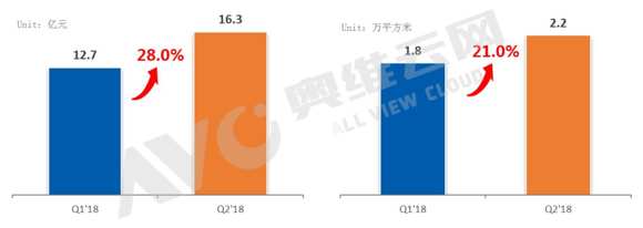 銷售額29億元,同比增長70.5%;銷售面積實現(xiàn)51.9%的同比增長,達4萬平方米。 2018年H1中國小間距LED國內(nèi)市場銷售額和銷售面積及其環(huán)比 數(shù)據(jù)來源:奧維云網(wǎng)(AVC)顯示器件與系統(tǒng)大數(shù)據(jù),單位:億元